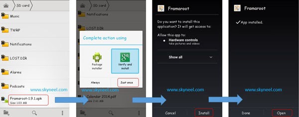 Step 4: Install Framaroot App on your phone. After then tap on App file >>> You will get a popup tab then select by tap on the verify and install option >>> After then tap on Just one option >>> Now tap on install.