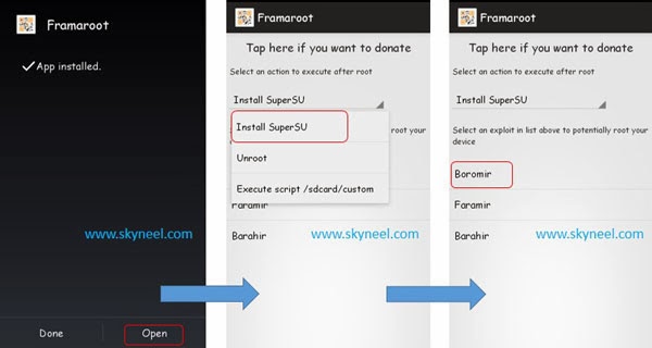 Step 5: After completion, you will get two option first one “Done” and second one “Open” . Now tap on the open and run Framaroot App and Now Select “Install Super Su”.