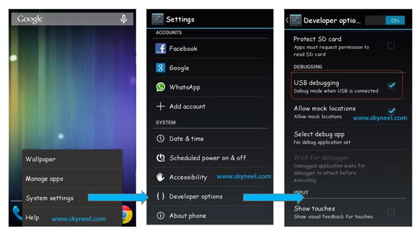 Step 2: Enable USB Debugging on your Phone. Go to Settings >>> Developer options >>> USB debugging check it ( If your phone have Android 4.2 or upper version then first enable Developer options here is guide of this Click here)